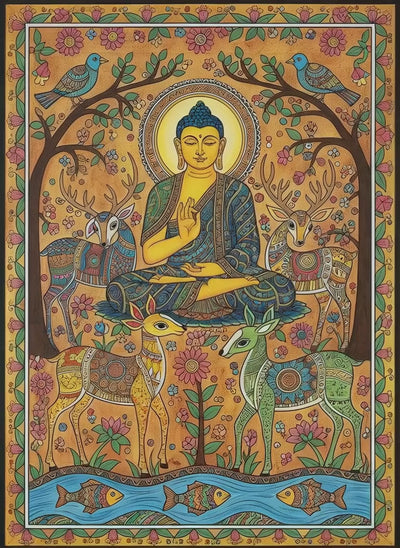 Handpainted Madhubani Painting – “Buddha in Harmony with Nature”
